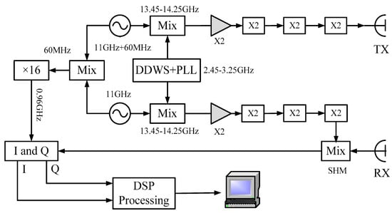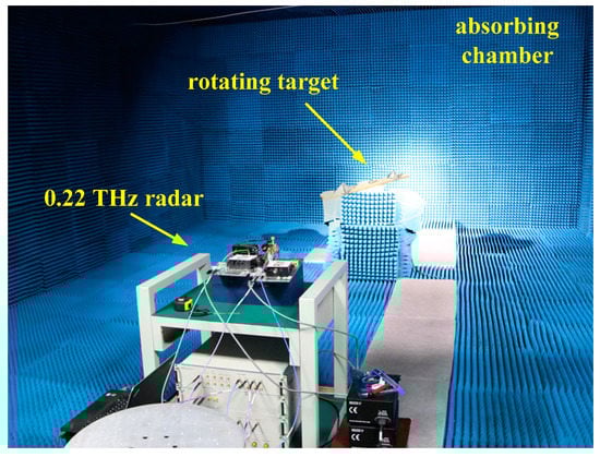 A 0.22 THz radar system was established, and experiments were carried out to verify the micro-Doppler ambiguity resolution method proposed in this paper. The terahertz radar system mainly consists of four modules: the signal source, the RF chains, intermediate frequency (IF) module, and the data collection module. The signal source module consists of a direct digital waveform synthesis (DDWS), a phase locked loop (PLL) and two coherent local oscillators with a difference frequency of 60 MHz. The PLL can generate signals that have characteristics of broadband, low spur, and low phase noise through rapidly changing the frequency dividing factor []. An initial signal range from 2.45 to 3.25 GHz is generated by the DDWS and the PLL, and is then modulated onto the coherent local oscillators to output the IF signal varying from 13.45 to 14.25 GHz. The mode of the IF signal can be continuous wave (CW), FMCW, or others. For the sake of intra-pulse processing in this method, we choose the FMCW mode, and its average output power is about 100 mW.