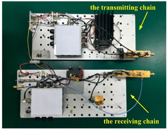 The RF chains are the key design of the terahertz radar system. They consist of the transmitting chain and the receiving chain. In the transmitting chain, the Ku-band IF signal is multiplied into the terahertz band after power amplifying and frequency multiplications, and the terahertz signal is then transmitted by a conical horn antenna. Because we set the frequency range of the IF signal to 13.45 to 14.25 GHz, the carrier frequency of this radar system is about 0.22 THz, and the bandwidth is 12.8 GHz. Through harmonic mixing in the receiving chain, the received terahertz signal is down-converted to IF for super heterodyne reception. In order to obtain high sensitivity and a large dynamic range of the system, a high precision controllable digital attenuator with a maximum attenuation of 30 dB is added to the receiving chain. Through the sub-harmonic mixer (SHM) in the receiving chain, the terahertz signal is down-converted to baseband and demodulated by an I/Q demodulator for A/D sampling. The data acquisition and control electronics are based upon a signal processing board with a 14 bit A/D-card with a sampling rate of 40 MHz/s. Finally, Ethernet transmits the collected data to the PC for further processing. Both transmitting and receiving signals are controlled by a PC via the PC serial ports and the control software. The schematic diagram of the 0.22 THz radar system is shown in Figure 2, and its transmitting and receiving front-ends are shown in Figure 3.