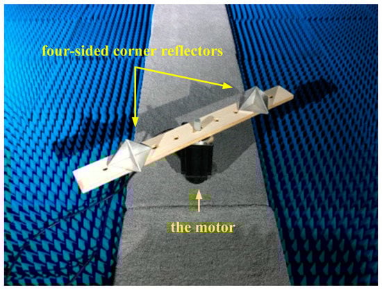 The targets are two rotating four-sided corner reflectors driven by a motor, and the four-sided corner reflectors can be seen as ideal point targets. The rotation angular velocity of the motor is precisely adjustable from 0 to 500 r/min, and the rotation amplitudes are 16 and 24 cm, respectively. The distance between the terahertz radar system and the rotating target is set to 5 m. The motor is covered with absorbing material, and all other devices are placed in an absorbing chamber to minimize the noise of the background. In the experiments, the sampling point of each frequency-sweep period is set to 4096, and the PRF of the signal is set to 1000 Hz. The experimental scenario and the rotating targets are shown in Figure 4 and Figure 5.