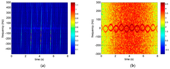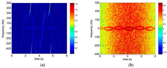 Time–frequency distributions of corner reflectors rotating at 60 r/min (a) before and (b) after intra-pulse interference processing.