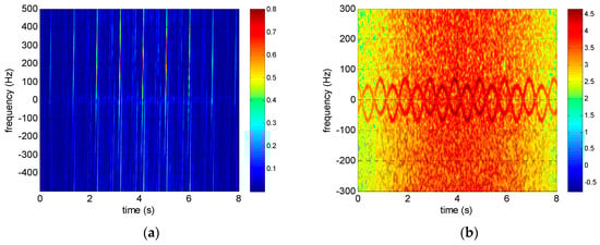 Time–frequency distributions of corner reflectors rotating at 20 r/min (a) before and (b) after intra-pulse interference processing.