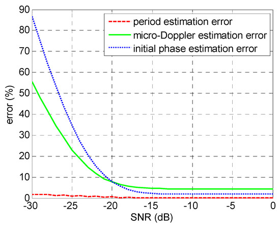 The signal-to-noise ratio (SNR) of the echo signal is generally an important factor for parameter estimation accuracy; however, it has a limited impact on the method proposed in this paper, primarily because of the good noise immunity performance of several operations such as the autocorrelation, the coherent accumulation, and the inverse Radon transform. By Monte Carlo simulation, the relationships between SNR of the echo signal and the parameter estimation errors are qualitatively shown in Figure 9. The target in simulation is two scattering centers rotating at 16 cm and 24 cm, respectively, just like the experimental scenario in Section 3. The SNR of the echo signal ranges from −30 to 0 dB. As can be seen from Figure 9, the method proposed in this paper is of good anti-noise ability, especially when the SNR is greater than −17 dB. As periodically of the signal or its time–frequency is less affected by the signal noise, micro-motion period estimation error keeps a low level from −30 to 0 dB. The micro-Doppler estimation error and the initial phase estimation error are maintained within 5% when the SNR is greater than −17 dB. Below −17 dB, each signal is seriously contaminated by noise, and the time–frequency analysis and inverse Radon transform cannot work effectively, despite the adoption of intra-pulse interference processing.