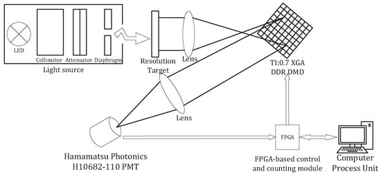 The schematic diagram of the single-photon compressed imaging system is shown in Figure 1. Figure 2 shows the photo of the light path of our single-photon compressed imaging system. The light source consists of LED, collimator, attenuator, and diaphragm. After the light emitted by the LED passes through the collimator, the attenuator, and the aperture, it becomes a very weak parallel light whose intensity is on the single photon level. The target is imaged on a DMD by a lens. The DMD (TI:0.7 XGA DDR DMD) has micromirrors, the size of these is 13.68 m × 13.68 m. The DMD serves as the spatial light modulator by loading a random binary matrix into it. Each micromirror has two states of deflection. A deflection of +12 degrees and −12 degrees is represented by “0” and “1”, respectively. We placed a focusing lens in the +12 degree direction and collected the modulated light into a photon counting PMT (Hamamatsu Photonics H10682-110 PMT). As a point detector, the PMT can simultaneously collect the light intensity of multiple pixels on the imaging surface when performing one measurement. Therefore, the signal-to-noise ratio is very high, enabling imaging with higher detection sensitivity. A FPGA-based control and counting module is developed to load M random binary patterns into the DMD in order to achieve random modulation of the image on the DMD, and simultaneously record the number of photons collected by the detector after each modulation. The photon number corresponds to the intensity of the modulated light. After it is sent to the computer, the image is reconstructed based on CS theory.