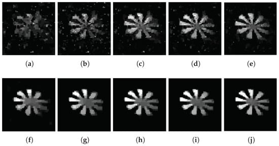 Figure 3a–e show the images of different compression ratios measured by the Gaussian random matrix. Figure 3f–j show the images of different compression ratios measured by the adaptive measurement matrix.