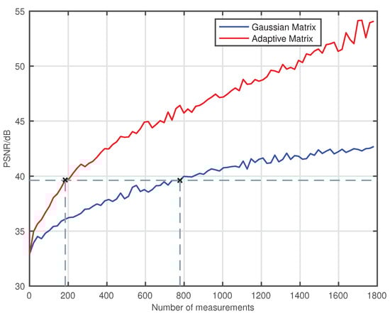 PSNR of image reconstructed with number of measurement time from 0 to 1800 with a step of 20, which measured with the Gaussian random matrix and the adaptive measurement matrix. When the PSNR of both image is 39.6 dB, the image measured with the Gaussian random matrix requires 779 measurements, while the image measured with the adaptive measurement matrix requires only 184 measurements.