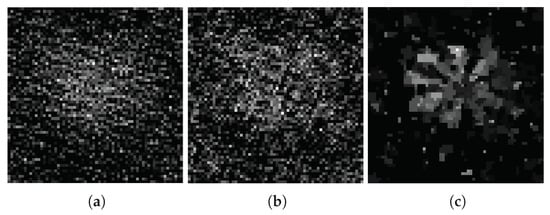 From the theory above, we can draw a conclusion that the sparsification of signal, the construction of measurement matrix, and the reconstruction algorithm are the cores of CS theory. The researchers have proposed several algorithms with high performances, like orthogonal matching pursuit (OMP) [], regularized orthogonal matching pursuit (ROMP) [], iterative hard thresholding (IHT) [,,], and TV minimization by Augmented Lagrangian and ALternating direction ALgorithms (TVAL3) [,]. Involved in both the process of CS and the reconstruction of signal, therefore, the design of the measurement matrix affects the performance of the entire system. The measurement matrix can be divided into random measurement matrix [,] and adaptive measurement matrix. Common random measurement matrices include the Gaussian random matrix, the local Hadamard matrix, and the partial Fourier matrix. In this study, we present a fast and effective method to construct an adaptive measurement matrix to reduce the number of measurements and shorten the imaging time of the single-photon compressed imaging system.