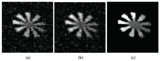 In the case of the sampling rate is 0.15, the image measured by Gaussian random matrix reconstructed by OMP (a), IHT (b), and TVAL3 (c) algorithms. The resolution of the image is all .