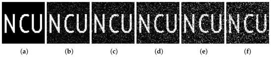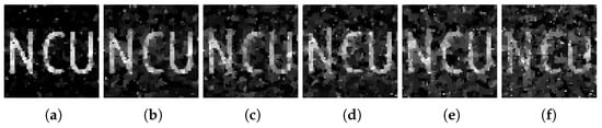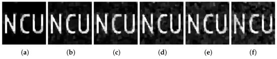 Image added Gaussian noise with a mean of 0 and variance of (a) 0, (b) 0.02, (c) 0.04, (d) 0.06, (e) 0.08, and (f) 0.1. The resolution of the images are all .