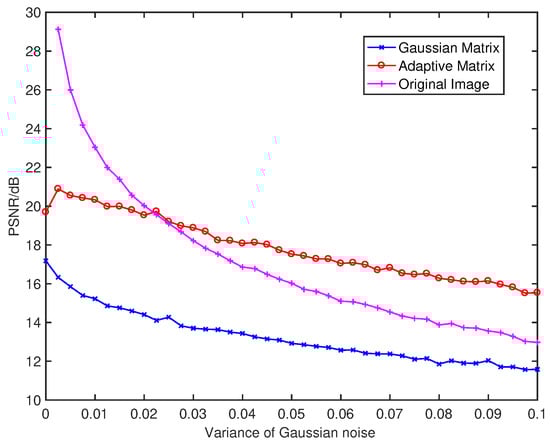 PSNR of image reconstructed from the original image added with Gaussian noise, which with a mean of 0 and different variance of 0.0–0.1 by using the adaptive matrix measure with the Gaussian random matrix and the adaptive matrix, the resolution of the image is all , and the reconstructed algorithm is TVAL3.