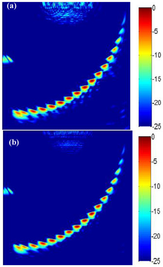 Moreover, in order to make the sound field characteristics of the sparse array consistent with those of the full array, the sparse transmit/receive elements should be weighted to make the sparse array coincide with the effective aperture of the full array by selecting the appropriate weight functions [24]. Figure 2a–c show the effective aperture and the point spread functions (PSF) in the far field [24] of TFM, the uncorrected sparse-TFM and the corrected sparse-TFM, respectively. It can be seen that the corrected sparse array has the same effective aperture with the full array, and the intensity of each point in the corrected sparse-TFM image can be expressed as [25]: