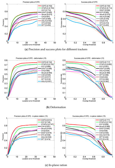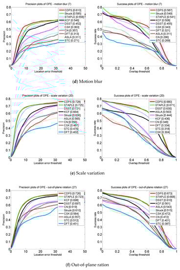 Due to the complex scene, the effect of the object tracking algorithm was usually greatly related to the datasets. In order to further prove the effectiveness of the proposed algorithm, extensive experiments were performed on OTB-13 datasets; our method obtained the top rank in performance, outperforming nine state-of-the-art trackers on OTB. Figure 5 shows a graph of the accuracy and success rate of the algorithm and of the nine state-of-the-art trackers on different attribute sequences of the OTB-13. It can be seen from Figure 5 that the algorithm achieved good tracking results on these seven attributes, especially in the target deformation sequence, that the CDPS tracker in this paper was 4% more accurate than Staple, and that the success rate increased by 2.5%. In the motion blur sequence, the CDPS was 5.2% more accurate than Staple, and the success rate improved by 4.6%. In the in-plane ration sequence, the tracker CDPS accuracy improved by 6.3% compared to Staple, and the success rate increased by 3.5%. By analyzing the results in Figure 5, it can be seen that compared with other tracking algorithms, the tracking method proposed in this paper reached the level of current mainstream algorithms in terms of tracking performance.