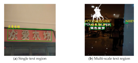 Scene text reading includes text detection and recognition, which is becoming mainstream technology for deep learning because of its excellent performance. The generalization ability of the object detection model allows for achieving the task of text detection. The Region Convolution Neural Network (R-CNN)-based object detection model [1,2,3] and its improved version trade speed for accuracy. The results of high mean Average Precision (mAP) makes R-CNN a general and basic model of text detection. Mask R-CNN [4] extends R-CNN detection methods and is applied to image segmentation. By comparison, detection models such as You Only Look Once (YOLO [5,6,7]) and Single Shot MultiBox Detector (SSD [8]) improve detection speed at the expense of slight accuracy. The ingenious trade-off between speed and the accuracy leads to the popularity of these models. Text recognition is responsible for recognizing texts in detection regions, and it usually adopts CNN, Long Short-term Memory (LSTM), and attention models.