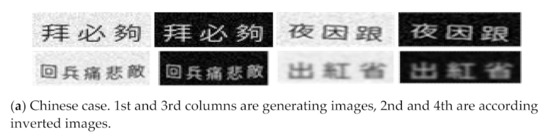 Figure 10c shows that the background of the image affects the text detection. Thus, we invert the generated dataset by rendering the background of the image to black and texts to white. Figure 11 shows the comparison between the original generated dataset and its inverse. Based on previous studies [9], dataset ICDAR2019 Art, LSVT, and ReCTs serve as the training set. In addition, the generated dataset and its inverted version are added in the training phase respetively, and then the verification is performed on RCTW-17. Table 4 lists the results. “Ours (generated)” indicates the training on datasets including ICDAR2019 and the generated dataset, while “ours (inversed)” means the training on dataset including ICDAR2019 and the inverted dataset. The results show that inverted images with less interference, such as background texture, effectively improve the recognition accuracy.