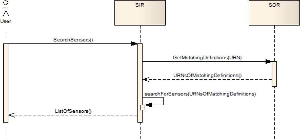 Figure 2 illustrates how the SOR can be used in order to enhance the SIR search functionality. If a user searches sensors that observe a certain phenomenon he sends an according search request to the SIR. The SIR analyzes the search request in order to determine which phenomenon the user is interested in. In the next step the SIR requests a list of definitions from the SOR which match to the one it has received within the search request. The SOR then uses reasoning mechanisms to identify the matching phenomenon definitions and returns a list of URNs of all matching definitions to the SIR. After this the SIR queries textually its search indexes for all sensors which observe one of the phenomena identified by one of the URNs contained in the response received from the SOR. In a last step the SIR returns a list of discovered sensors to the user.