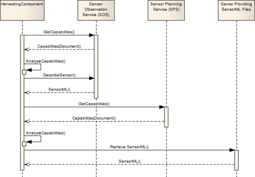 The harvesting mechanisms for retrieving metadata are making direct use of the according operations as specified within the different OGC standards. In order to avoid redundancies, this article focuses on the SOS and the SPS Service whereas the SAS is not explicitly described as the harvesting works similar to the SPS. The WNS will also not be addressed as it is a helper service within the SWE framework which provides no directly sensor related functionality.