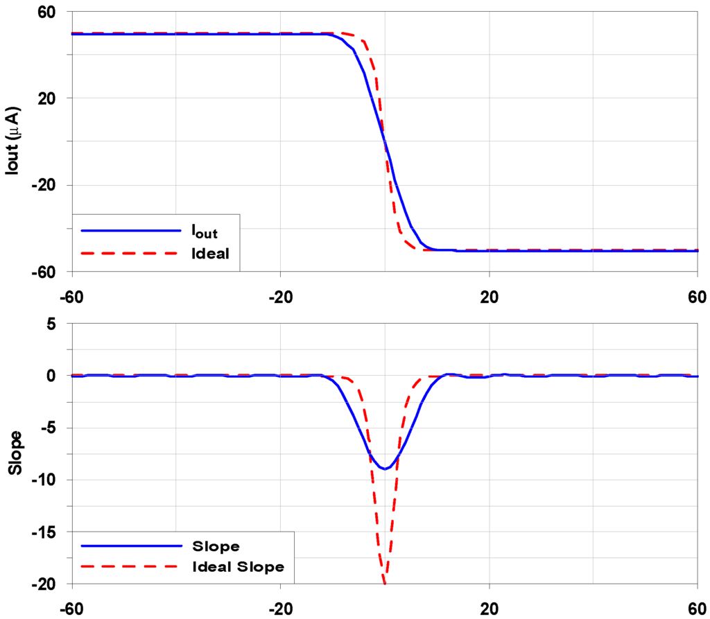 (Top) Logistic circuit operation compared to an ideal behaviour. (middle) Slope difference. (Bottom) Output error.