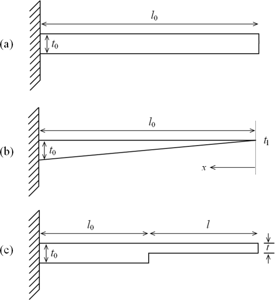 Since it is not possible to achieve zero tip thickness for a cantilever, the triangular profile can be approximated as a trapezoidal profile, of the form t(x) = tl + (t0 – tl) x/l, having very small tip thickness (Figure 1b).