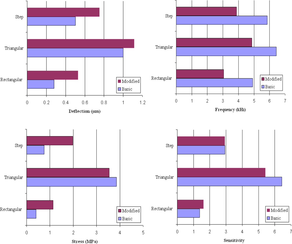 Results showing deflection, frequency, stress, and sensitivity values for the basic and modified design rectangular, triangular, and step profile cantilevers.