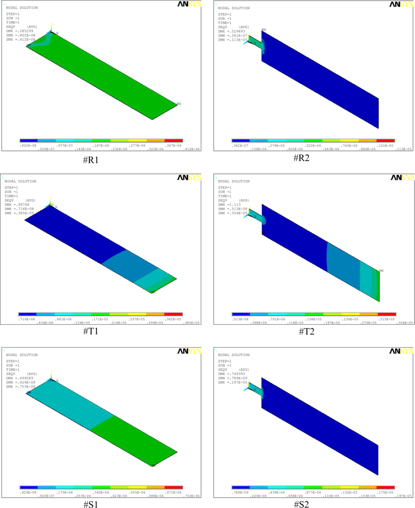 Figure 4 shows the simulation results for stress distribution in all the six designs analyzed in this study. The maximum stress (SMX) and the maximum deflections (DMX) values are indicated in the top-left corner of the micrographs. In the analysis, we used micrometre as the unit of length and newton of force. Accordingly, in the figure, the cantilever size and deflections are expressed in micrometres and the stresses in TPa (i.e., 106 MPa). A comparison between the stress values of #R1, #T1, and #S1 shows that profile change alone increased the stresses from 0.41 to 3.85 and 0.75 MPa, respectively (Figure 4). The maximum induced stresses ranges from a minimum of 0.41 MPa for #R1 to a maximum of 3.85 MPa for #T1. Stress analysis results indicate that since the induced stresses are much less than the ultimate strength of 300 MPa for silicon [], we may conclude that all the cantilevers designs are safe.