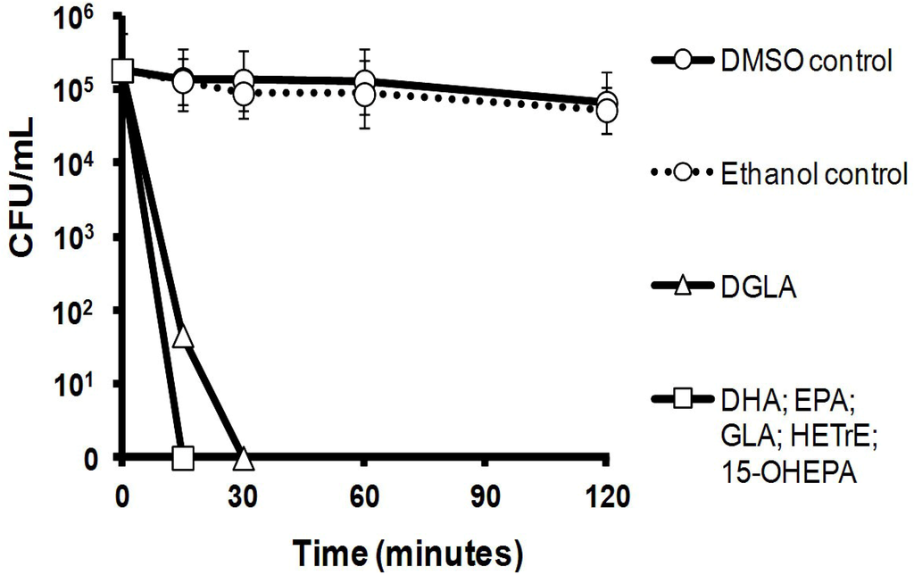 The killing kinetics of the six LC-PUFAs were determined at 1 × MBC against ~2.6 × 105 colony forming unit (CFU)/mL inoculums of S. aureus ATCC43300 prepared in phosphate-buffered saline (PBS). The incubations were performed at 37 °C and there was little change in the viability of cells in the control group that were exposed only to the carrier solvents, ethanol and DMSO. Importantly, the LC-PUFAs killed the S. aureus inoculums rapidly and no viable bacteria were detected within 15 min of initial exposure for five of the six LC-PUFAs, with DGLA taking just 30 min to completely kill the inoculum (Figure 1).