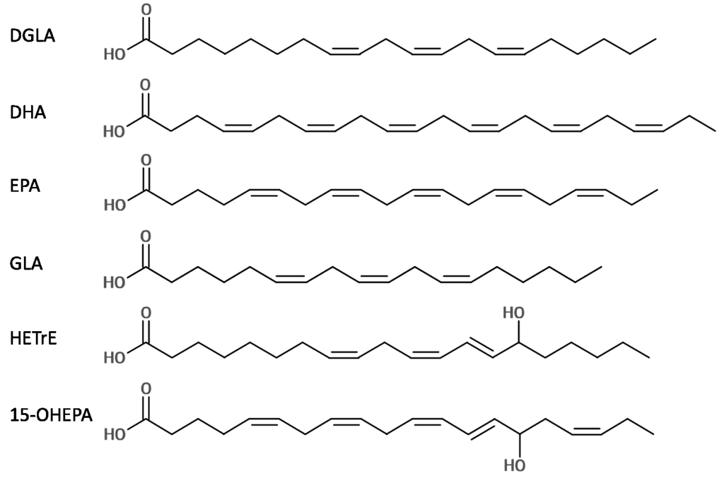 Molecular structures of the six LC-PUFAs used in this present study. All double bonds are in cis orientation except for the n-7 bonds of 15-HETrE and 15-OHEPA that are in trans orientation.