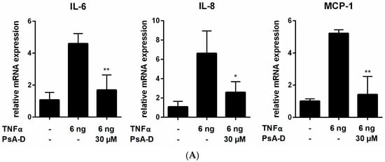 As multiple pro-inflammatory cytokines such as IL-1, IL-6 and TNFα represent target genes of NF-κB [41,42,43], we investigated the effect of PsA-D on pro-inflammatory cytokine release.