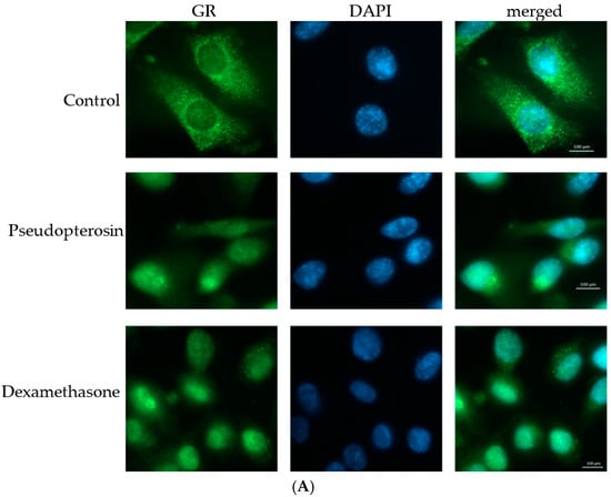 Our data show for the first time that the underlying in vitro mechanism of the well described anti-inflammatory response of pseudopterosin might be ascribed to inhibition of the NF-κB pathway. To further explore putative molecular pharmacological targets of pseudopterosins, we started to investigate the influence of the natural product on glucocorticoid signaling. NF-κB and glucocorticoid receptor α (GR) display opposed functions in regulating immune and inflammatory responses. Moreover, both transcription factors have been described as transcriptional antagonists [36]. Thus, we investigated the interaction of pseudopterosin with GR. To evaluate transactivation of GR in the presence of PsA-D on the whole cell level, we used immunofluorescent staining of GR in MDA-MB-231 cells incubating the cells with dexamethasone, serving as a positive control, or PsA-D (Figure 5A). Untreated cells displayed an even GR distribution within the cytosol, whereas the nucleus did not show any GR localization. As expected, upon dexamethasone treatment the GR staining revealed a complete translocation of the receptor to the nucleus in breast cancer cells. Interestingly, the presence of pseudopterosin induced a comparable nuclear translocation of the GR. Quantification of the respective fluorescence intensities using the software ImageJ confirmed a significant GR translocation to the nucleus after dexamethasone treatment (4.5-fold reduction of cytoplasmic total corrected cell fluorescence (TCCF) compared to control) and pseudopterosin treatment (2.5-fold reduction of cytoplasmic total corrected cell fluorescence (TCCF) compared to control, Figure 5B). Accordingly, PsA-D inhibited phosphorylation of p65 and IκBα significantly compared to LPS stimulation (Figure 5C) or compared to stimulation with TNFα (Figure S2) (2-fold inhibition, respectively).