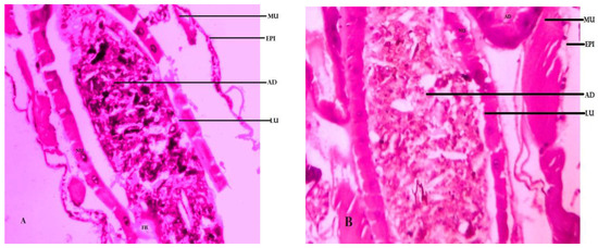 Histopathological results clearly show that midgut epithelial cells (epi) were severely damaged by B. bassiana-28 extract. Gut tissue of lumen was mutually by way of a thin peritrophic membrane (Pm) in 6 h treatment as compared to control (Figure 5B), whereas, at 12 h and 24 h treated midgut epithelium layer was damaged and cells were vacuolated but remained together with the nuclei and membrane was entirely bust during action with B. bassiana-28 (Figure 5B,C) also the lumen substance (lu) seeped out into muscles cells (mu). In muscles was appeared barely injured and fat bodies were confused.