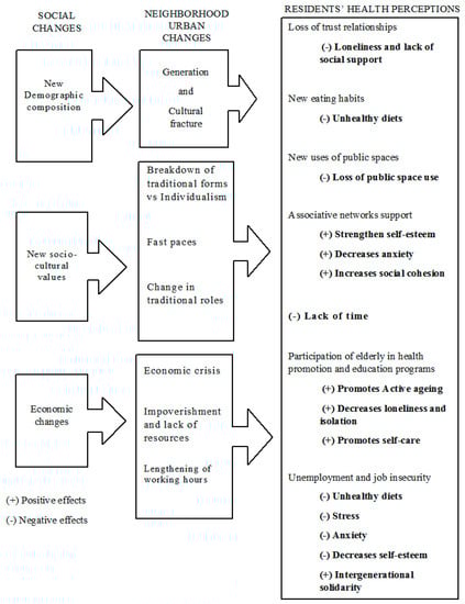 Figure 1 shows the social changes shaping the neighborhood’s urban changes, further affecting participants’ perception of health in the studied neighborhood. This figure illustrates three different levels: The first level includes global components and alludes to current social changes; the second level refers to neighborhood urban changes, triggered by the social changes in the neighborhood; finally, the third level focuses on the effects on residents’ health perceptions derived from life practices determined by urban changes.