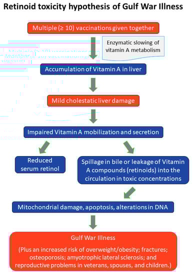 Specifically, we propose that the adverse effects of multiple vaccinations received together, or over a short period of time, concurrently with other biochemical insults to the liver, may be initiated by interference with the hepatic metabolism of vitamin A, causing a mild cholestatic condition in which stored vitamin A metabolites (“retinoids”) spill over in the bile or leak into the circulation from damaged hepatocytes in toxic concentrations, inducing mitochondrial damage and apoptosis. On this hypothesis, the signs and symptoms of GWI as well as the related syndromes of fibromyalgia, chronic fatigue and multiple chemical sensitivity are manifestations of liver damage and a resulting chronic, endogenous form of hypervitaminosis A (see Figure 1).