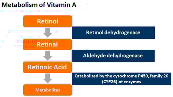 Retinoic acid (RA), the main biologically active form of vitamin A, binds to and activates specific retinoid receptors that regulate the transcription of many target genes []. RA is produced from free retinol via the hydrolysis of retinyl esters in the liver, the release of retinol into the circulation, and its subsequent delivery to the target tissues bound to retinol-binding protein (RBP). Retinoic acid is synthesized from the oxidation of retinol to retinaldehyde via an alcohol dehydrogenase, and from retinaldehyde via an aldehyde dehydrogenase reaction [] (see Figure 2).
