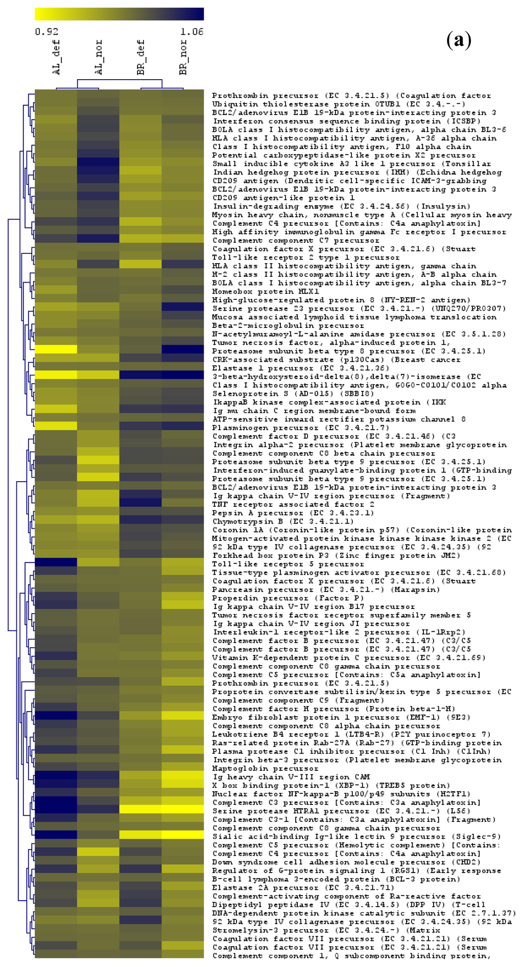 Another major group of immune system related genes encoded for histocompatibility antigens. Relatively large mean expression differences in both forms between normal and deformed fish were further observed for the “proteasome subunit beta type 8 precursor” gene, which plays an important role in antigen processing. All these genes were down-regulated in deformed fish of both forms. In contrast, a few immunoglobulin genes of the heavy or kappa chains were up-regulated (Figure 5a). Furthermore, in the liver, 44 genes were in common between GO terms “proteolysis” in the Albock and “extracellular region” in the Brienzlig. It is interesting that 18 of these 44 genes were in common with the 19 specific genes involved in complement activation, which is indicated in Figure 5b. Additionally, a small group of genes encoding for coagulation factors and collagenase precursors was down-regulated in deformed fish; however, 33 out of the 44 shared genes were up-regulated (Figure 5b).
