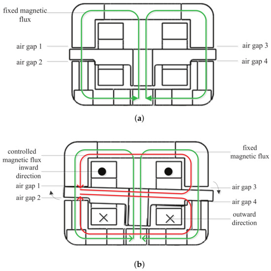 In Figure 2b, however, the two coils are energized with the same current input. The power supply goes out of the paper for the upside of the windings and returns into the paper for the downside, forming a closed current loop. Both coils produce a magnetic flux going through two parallel ways, that is, one from the armature to the upper iron, returning to the armature, and the other from the armature to the lower iron block, returning to the armature. The magnetic flux produced by the coils is superposed with that by the permanent magnets. The resulting magnetic flux at air gaps 1 and 4 is enhanced as a result of the same direction of the flux by the magnet and coil, whereas it is weakened at air gaps 2 and 3 as a result of the opposite direction of the flux by the magnet and coil. Therefore, the attraction force at air gaps 1 and 4 is larger than that of 2 and 3, which causes the armature to rotate clockwise. Similarly, if the current input in the two coils reverses the direction, as shown in Figure 2c, the superposition of the magnetic flux leads to the anticlockwise rotation of the armature. The continuous current switch leads to reciprocating motions of the armature. The opening and closing of the servo valve is dependent on the armature motion and thus the direction of excitation current, and the opening angle of the servo valve can be controlled by the value of the excitation current.