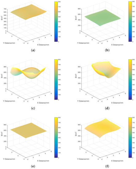 The analysis of the magnetic field distribution in air gaps of hydraulic torque motors has been done by other researchers previously. However, for simplification, these analyses generally assume an evenly distributed field in the air gaps, and the influence of the limiting hole in the air gap is ignored. In this study, to analyze the magnetic field distribution comprehensively, the influence of limiting holes is included. One coordinate system is established as shown in Figure 3. The -plane of the coordinate system is in the middle position of the air gap. The numerical result of the magnetic field distribution with respect to the x and y coordinates in the four air gaps is presented in Figure 4. Figure 4a,c,e,g represents the flux field status of the motor without a power supply, and the rest of the figures represent the flux field status with a 10 mA current input.