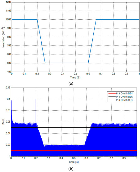 In the first part, a comparative study on the conventional P&O and the P&O based on fuzzy logic is done to show the performance of both techniques under similar conditions. The comparative study takes into consideration two important characteristics: the maximum power point’s tracking speed and the oscillation in the steady state. To display the practice of the suggested FLC-based P&O algorithm, this algorithm was tested with two reference voltage steps: 0.01 and 0.05 under two irradiation changes. The irradiation was changed from 1000 to 500 W/m2 at 0.2 s, then augmented to 1000 W/m2 at 0.6 s as shown in Figure 9a.