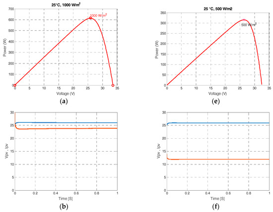 Simulation results of FLC-based P&O algorithm. Operating at 25 °C and 1000 W/m2 conditions; (a) P-V curve of PV array, (b) the PV array’s current and voltage, (c) Stator currents, (d) Motor speed, operating at 25 °C and 500 W/m2 conditions; (e) the PV array’s P-V curve, (f) the parameters (I, V) of the PV array, (g) Stator currents, (h) Motor speed.