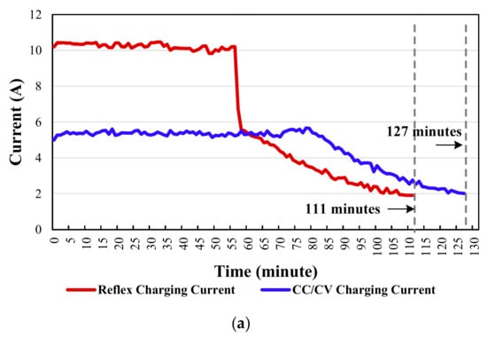 In order to demonstrate the advantages of the proposed RC-BDC, its performance was compared with the conventional BDC with the CC/CV charging profile. Figure 12a,b show the battery charging current ibat and the increased battery temperature curves with respect to the charging time. From Figure 12a, it is clear that the charging time of the proposed RC-BDC and the typical BDC with CC/CV charging profile are about 1.85 h and 2.12 h, respectively. The charging speed of the proposed RC-BDC has been increased by about 12.7% as compared to the typical BDC. According to Figure 12b, the maximum increased in the battery temperature of the proposed RC-BDC and the typical BDC are 5.6 °C and 7 °C, respectively. The results also demonstrated that the maximum battery temperature of the proposed RC-BDC can be reduced by about 25%. This means that the thermal deterioration effect is improved by about 25% with the proposed RC-BDC.