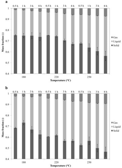 Generally, the longer the residence time and the higher the temperature, the lower is the hydrochar yield. Moreover, the mass lost by the feedstock during the process tends in proportion to move more to the gaseous phase than to the liquid phase. In particular, at longer residence times the liquid production tends to be lower, in proportion, than the gas released, since the gas production is slightly enhanced. This fact can be explained considering that, as the residence time increases, the compounds, which were solved in the liquid phase, degrade into gaseous compounds more and more. Thus, a part of the liquid compounds contributes to the formation of the gases. At higher temperatures, the gasification reactions occur faster than at lower temperatures: this fact can explain why at 250 °C the distribution of the mass lost during HTC between liquid and gas seems to be slightly time independent. Moreover, to analyze the carbon distribution between the three phases, the carbon balance for grape seeds was calculated and is reported in Figure 5.