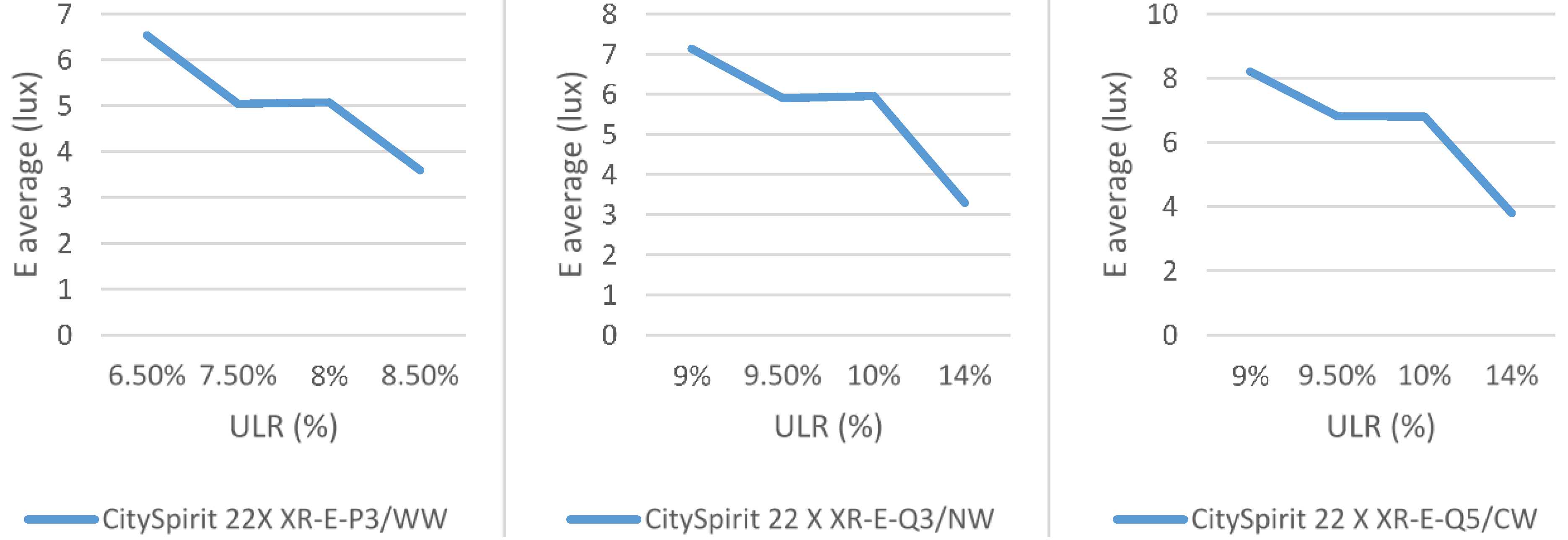 To analyze how ULR influences this kind of installation, several simulations were done with the DIALux software. The analysis consisted in studying what happens if the luminaire has the same kind of lamp and the street lighting globes are different. The model of the studied luminaire was the CitySpirit Modern (Philips, Amsterdam, The Netherlands), the street lighting globes were four and the kind of lamp was LED. Figure 1 shows the average illuminance regarding the ULR for 22 X XR-E-PE/WW, 22 X XR-E-Q3/NW and 22 X XR-E-Q5/CW lamps.