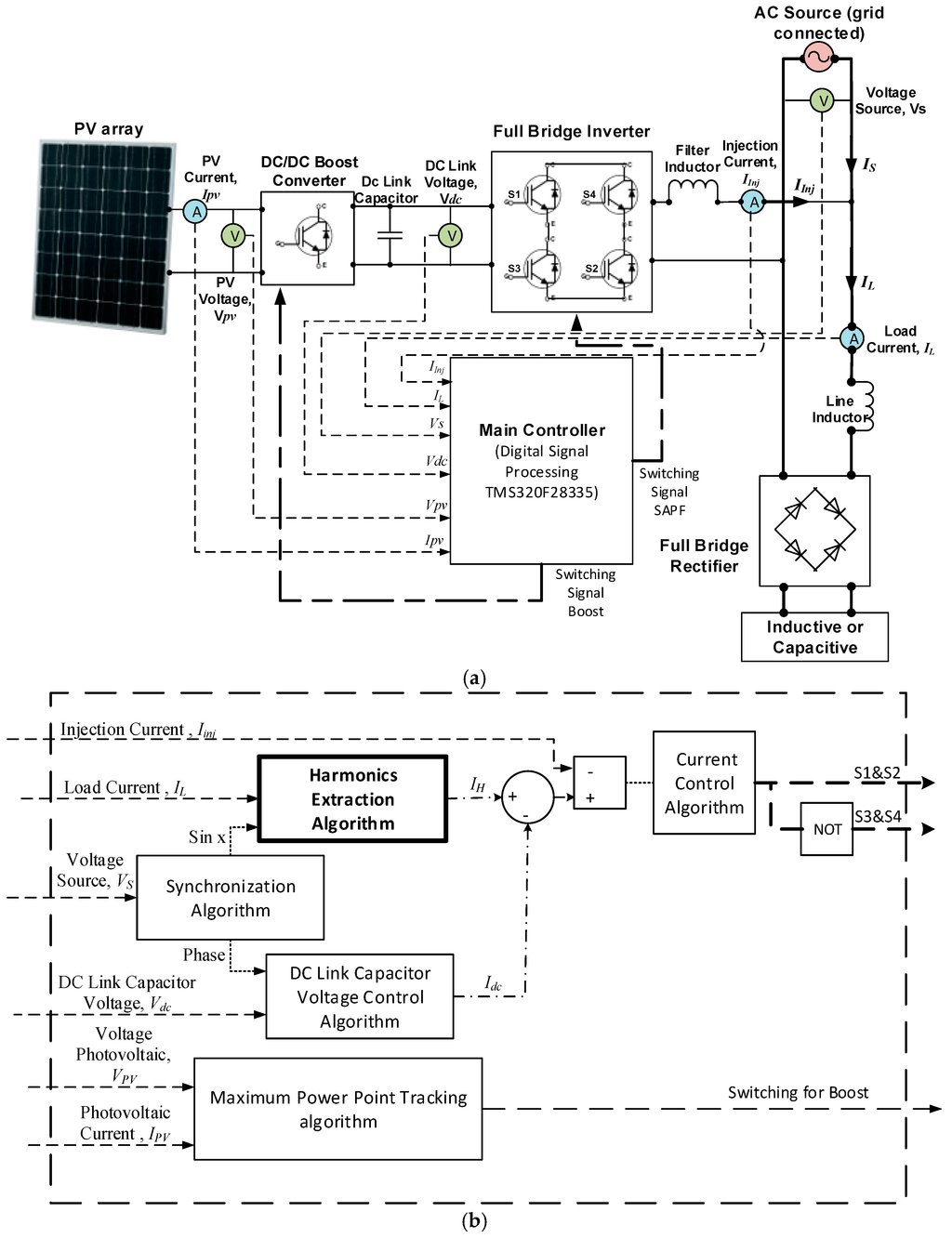 Diagram of (a) shunt active power filter (SAPF) integrated with PV and (b) control strategies inside it.