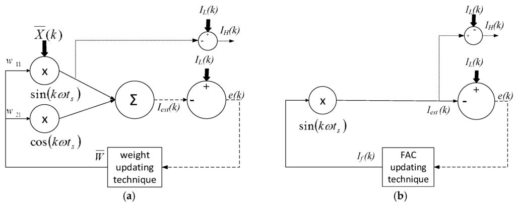 As explained earlier, the proposed harmonics algorithm is based on significant improvements to the Modified Widrow-Hoff (W-H) ADALINE, as successfully implemented in [,,]. As to ensure clear understanding, some significant parts of the Modified W-H ADALINE are explained first. The Modified W-H ADALINE uses the first order of harmonic component as shown in Figure 2a. It needs only to update the two weights of the fundamental component, making it independent of the number of harmonic orders. This improvement is based on the mathematical relationship of the elements being orthogonal to each other. This modification leads to enhanced iteration speed which resulting in faster estimation. However, updating only the two weights results in a large average square error e, and thus learning rate α must be added as in Equation (5) []. Average square error e(k) is the difference between the actual measured signal IL(k) and the estimated signal Iest(k):