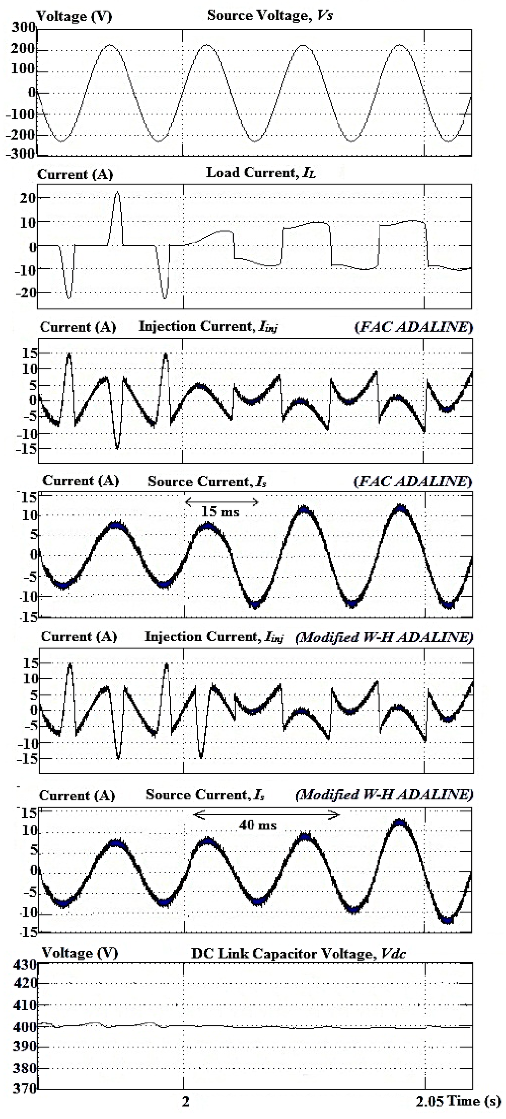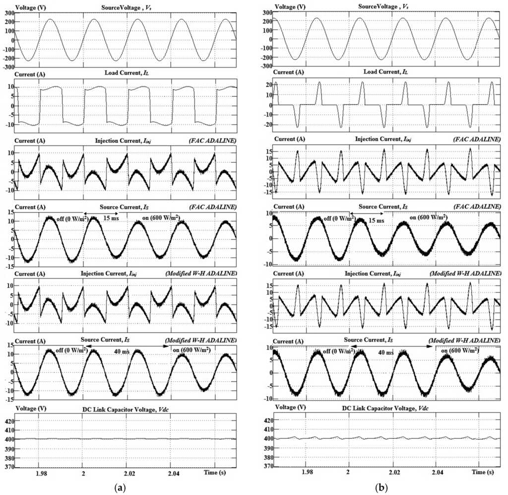 For the response time of the harmonics extraction algorithms one can be refer to Figure 7 and Figure 8, where during the first dynamic operation, the proposed algorithm shows faster response time for both nonlinear loads, with only 20 ms taken to respond to the change due to the PV being turned on. The existing algorithm needs 40 ms, which is 20 ms delay. The same goes for the second dynamic operation where the proposed algorithm shows faster response time for both nonlinear loads with also 20 ms to respond from low to high irradiance, whereas the existing algorithm takes 40 ms. For the performance under change of nonlinear loads, by referring to Figure 9, the proposed algorithm shows a faster response time (20 ms) as compared to the existing algorithm (40 ms). Figure 11 shows the performances of the dc link capacitor, and there are negligible overshoots for the capacitor voltage with a response time of 0.3 s, and for both extraction harmonics algorithms, no difference is observed, which verifies they are not affected to perform their roles. With faster response time, and also higher power reduction and better THD value, the FAC ADALINE algorithm has clearly shown its better performance as a harmonic extraction algorithm in SAPF as compared to the Modified W-H ADALINE algorithm.