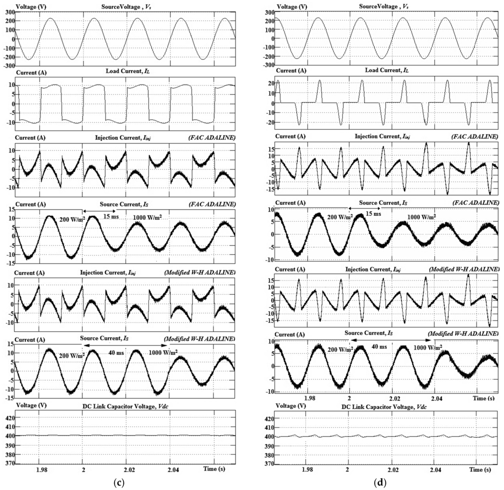 By using the FAC ADALINE algorithm, the reactive powers produced for inductive and capacitive loads are 410 VAR and 270 VAR, respectively. Meanwhile, by using the Modified W-H ADALINE algorithm, the reactive powers produced are 403 VAR for inductive load and 264 VAR for capacitive load. The higher reactive powers produced by the proposed algorithm also show its better compensation performance. Furthermore, high performance of the harmonics extraction algorithm is needed in a SAPF with PV source, to have high reduction of the active power from the source grid. When the PV is in on condition at 600 W/m2, the source powers greatly reduce by using the proposed algorithm, which are about 414 W (15%) for inductive load and 251 W (14%) for capacitive load, as compared to the existing Modified W-H algorithm with only 386 W (14.2%) for inductive load and 235 W (13.1%) for capacitive load. For irradiance at 200 W/m2, as shown in Figure 3c,d, the proposed algorithm reduces the source powers more, which are about 144 W (5.3%) for inductive load and 89 W (5%) for capacitive load, as compared to the existing Modified W-H algorithm with only about 124 W (4.6%) for inductive load and 72 W (4%) for capacitive load. The same goes for irradiance at 1000 W/m2 where the proposed algorithm reduces the source powers higher, which are about 644W (23.7%) for inductive load and 403 W (22.5%) for capacitive load, as compared to the existing Modified W-H algorithm which only reduces about 614 W (22.6%) for inductive load and 382 W (21.3%) for capacitive load. The proposed algorithm basically extracts accurate current harmonics to produce accurate injection current. With high injection current accuracy, better and precise mitigation of harmonics can be achieved thus lowering use of the source current. Subsequently, reduction of the source power can clearly be seen as compared to the existing Modified W-H algorithm. Table 4 and Table 5 show details of the active powers including load power, source power and source power reduction by using both harmonics extraction algorithms for each nonlinear load. Table 6 provides detailed comparison of percentages of source power reduction for both algorithms with capacitive and inductive loads. The results show that the FAC ADALINE algorithm has not only helped the SAPF to perform with lower THD values, but also to have high percentage of power reduction, as compared to the existing algorithm.