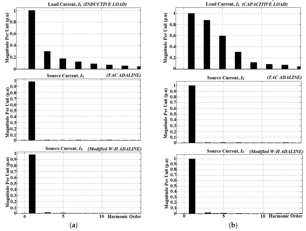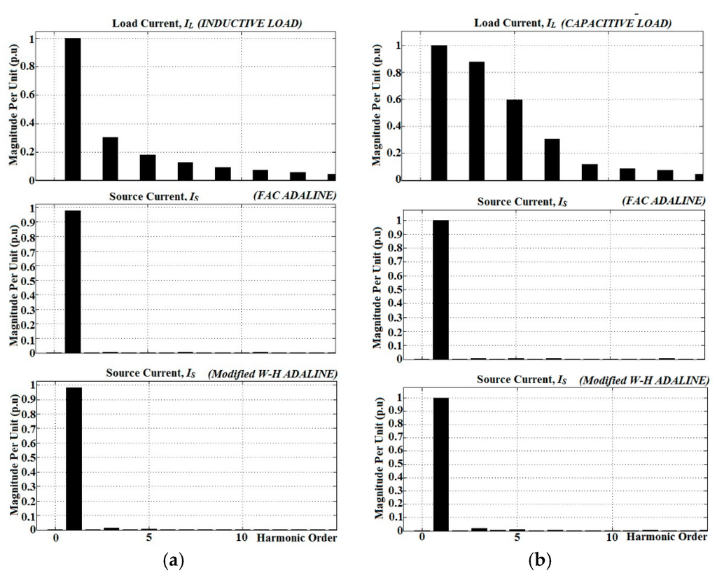 The FAC ADALINE algorithm was evaluated and compared with the Modified W-H ADALINE, as the existing algorithm []. Figure 3 shows the results obtained for off-on operation and change of irradiances using capacitive and inductive loads. Meanwhile, Figure 4 shows the results obtained for change between nonlinear loads. Figure 5 shows harmonics spectrum of the nonlinear loads’ currents and the source currents for operation of SAPF without PV. The nonlinear loads’ currents were recorded with THD in about 40.28% for inductive load, and meanwhile, for capacitive load, the THD is about 106.31%. Another additional analysis is power consumption required from the grid by considering integration of PV and SAPF. THD is also measured to evaluate significant effect due to injection of active PV current. By referring again to Figure 3a,b, and Figure 5 when the PV is in off condition (irradiance at 0 W/m2), both algorithms show good source current waveforms with low THDs and very good elimination for all harmonic orders; yet, the proposed algorithm still gives the best results with better THD values, which are about 1.5% (inductive) and 2.29% (capacitive). Meanwhile, the existing algorithm gives about 2% (inductive) and 3.13% (capacitive). In addition, the source current is in phase with the source voltage.