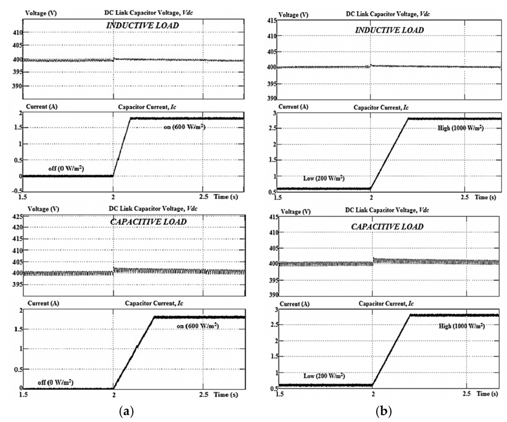 In term of response times under dynamic operations during off-on between PV and SAPF, and change of irradiances, the proposed algorithm shows better performance with only response time of 15 ms (capacitive and inductive). The existing Modified W-H algorithm however needs about 40 ms (capacitive and inductive), which is two cycles for 50 Hz system. Additional dynamic operation by changing the nonlinear loads was done, and as referred to Figure 4, the proposed algorithm also produces response time of 15 ms as compared to the existing algorithm which only gives response time of 40 ms. Performance of dc link capacitor has been investigated too for off-on between PV and SAPF, and change of irradiances from low to high, as shown in Figure 6.