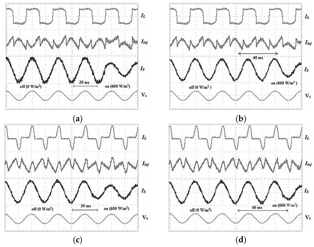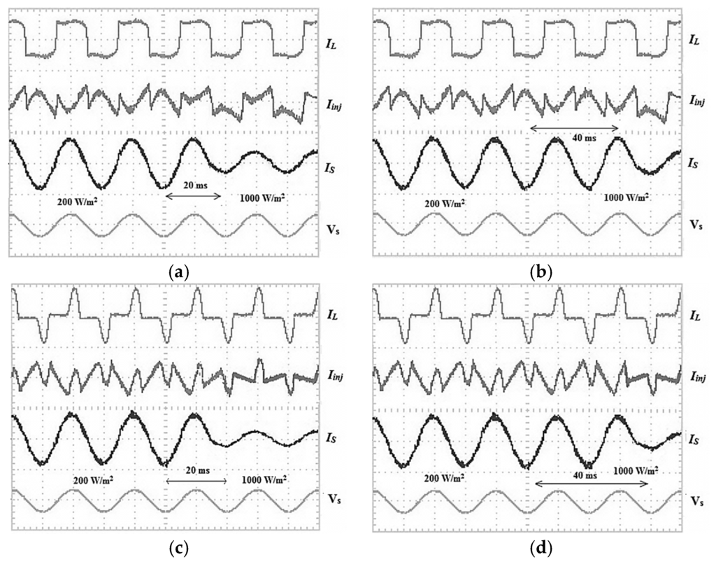 Experimental results of change of irradiances from low to high which covers the load current IL (5 A/div), the injection current Iinj (5 A/div), the source current IS (5A/div), and the voltage source VS (200 V/div), for (a) FAC ADALINE using inductive load; (b) Modified W-H ADALINE using inductive load; (c) FAC ADALINE using capacitive load and (d) Modified W-H ADALINE using capacitive load.