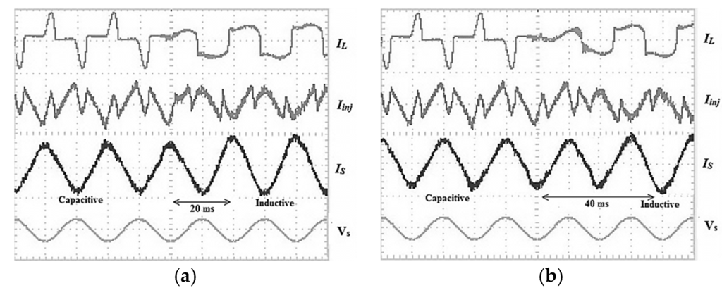 Experimental results of change of nonlinear load which covers the load current IL (5 A/div), the injection current Iinj (5 A/div), the source current IS (5 A/div) and the voltage source VS (200 V/div), for (a) FAC ADALINE and (b) modified W-H ADALINE algorithms.