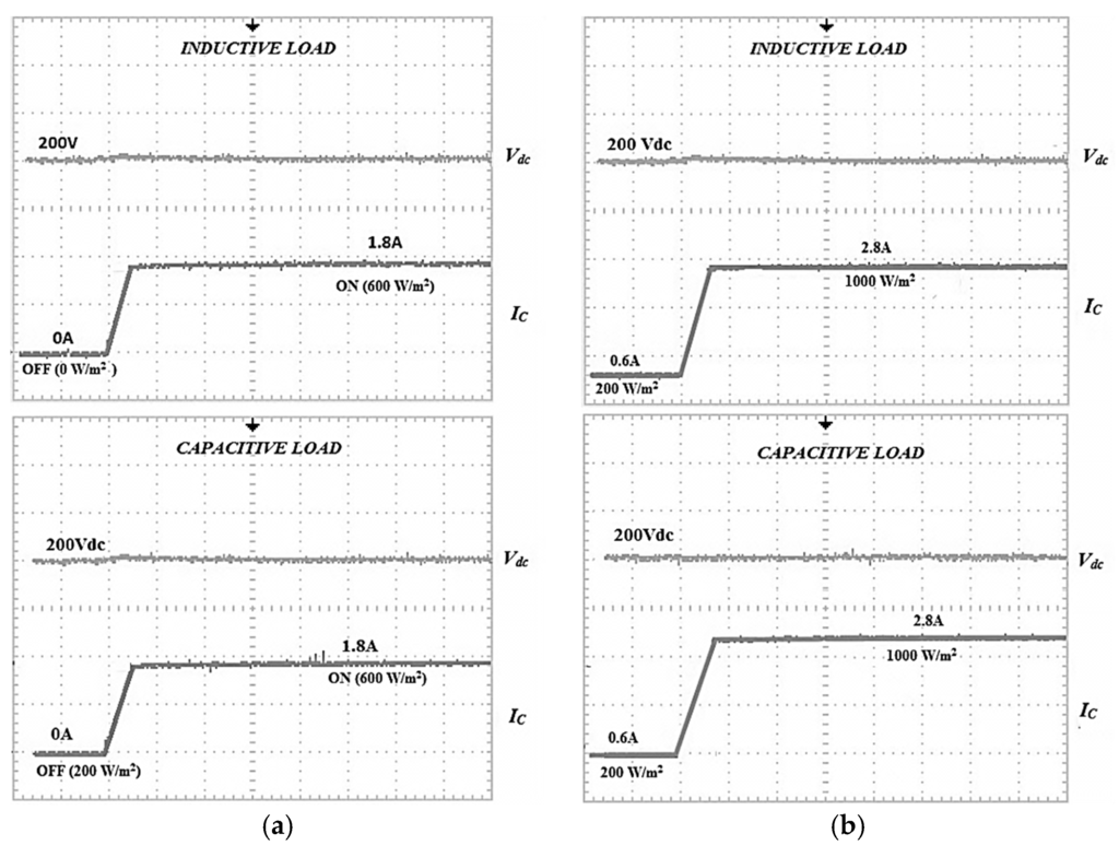 Performances of dc link capacitor voltage in the experimental work for (a) off-on between PV and SAPF and (b) change of irradiances from low to high.