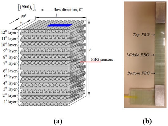 (a) The schematic drawing for stacking sequences together with the placement of FBG sensors and also the orientation of the cut test specimen indicated by the blue region where l, w and t indicate the length, width and the thickness of the manufactured composite plate; (b) L-shaped specimen that enables easy gripping of the test specimen by the testing system.