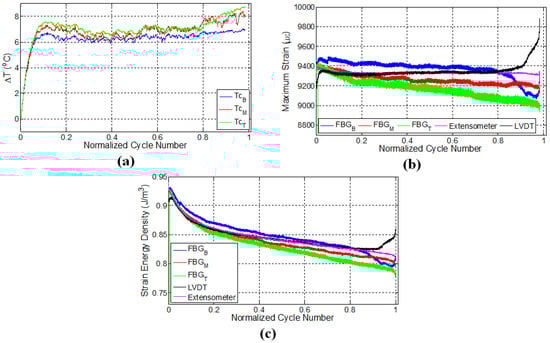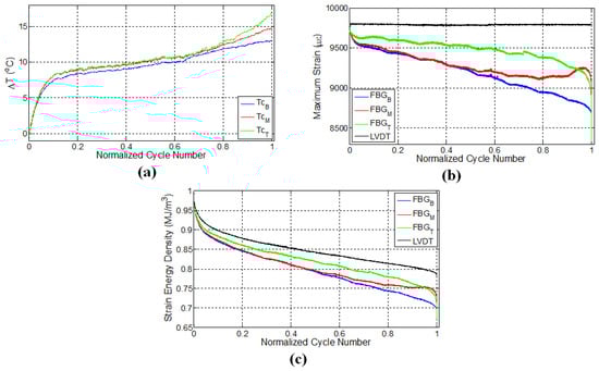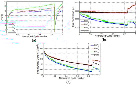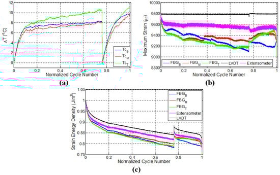 FBG strains and strain energy densities for the specimen L2 are respectively given in Figure 4b,c. Similar to the results of the previous experiment, FBG strains have a decreasing trend throughout the initial fatigue loading. When the fatigue loading was reinitiated, maximum strains measured by FBG sensors experienced a sudden jump compared to the maximum strain of the last cycle belonging to the first fatigue loading, even though the applied maximum displacement was kept the same. This is due to the thermal strain. It is seen that the specimen has a higher temperature at the end of the first fatigue loading than at the beginning of the second fatigue loading, which implies that a certain portion of the applied strain in the former case is contributed by the thermal strains associated with the thermal expansion of the specimen. When the specimens cool down and the predefined displacement is applied again for the second fatigue loading, the contribution from the thermal strain diminishes, and more force is required to induce the desired displacement onto the specimen, resulting in an upward jump in the measured force. This in turn influences the FBG strains along the specimen, causing it to experience a sudden increase.